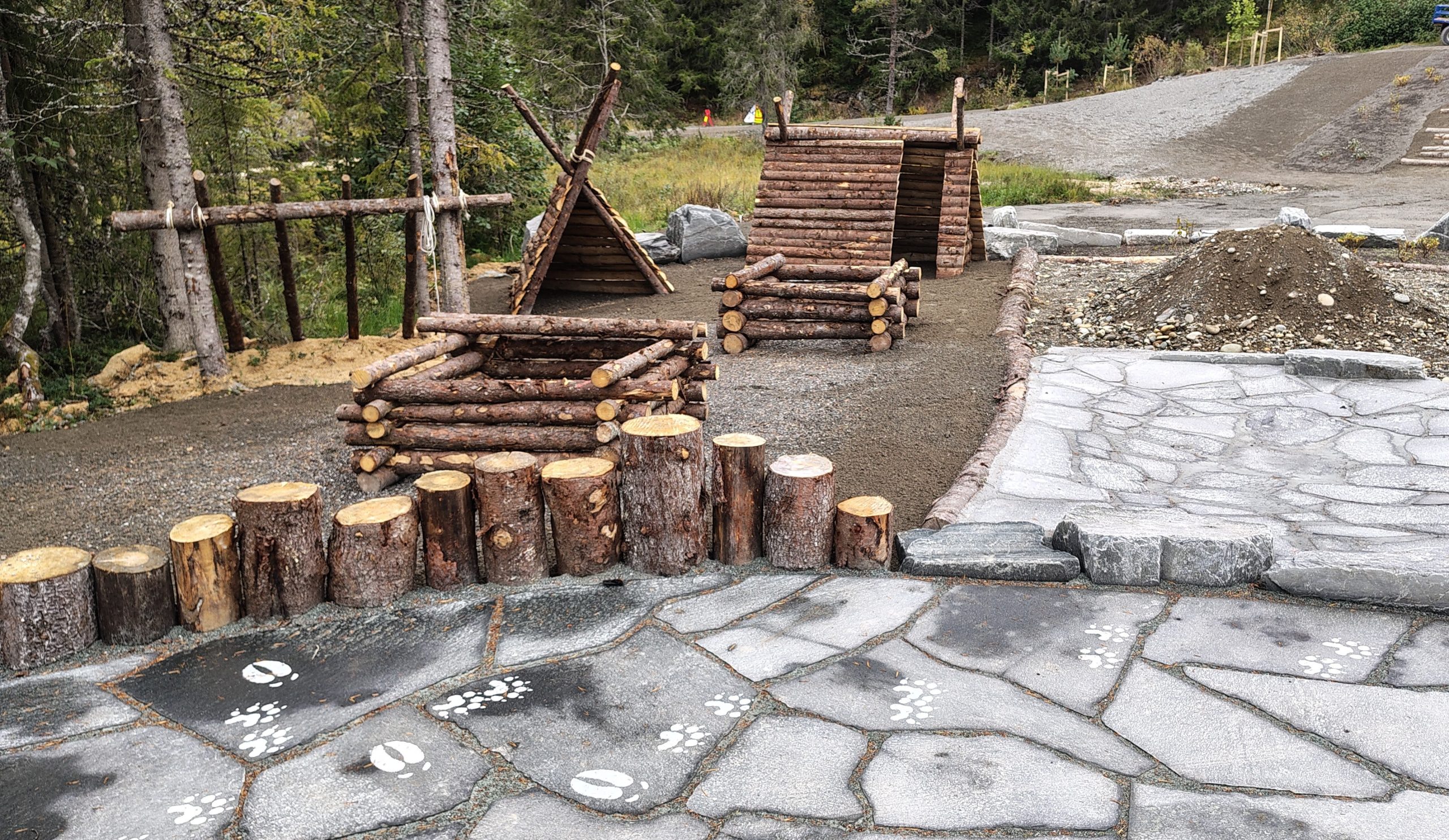 In Granåsen, the guiding principle was that all elements should be open for the children to define as ‘playable.’ The children should be able to choose for themselves how they want to use the environment, as long as it does not pose a significant hazard to themselves or others. Distinct zones were created to invite specific types of play and to prevent unnecessary interruptions to ongoing activities. The area with logs and trees primarily invites climbing and height-based risky play. “The Anthill” contains a mixture of rounded river stones, gravel, and sand. The nearby “Lumberjack Yard” consists of small huts, “pigpens,” and large logs designed to support both role play and construction play.