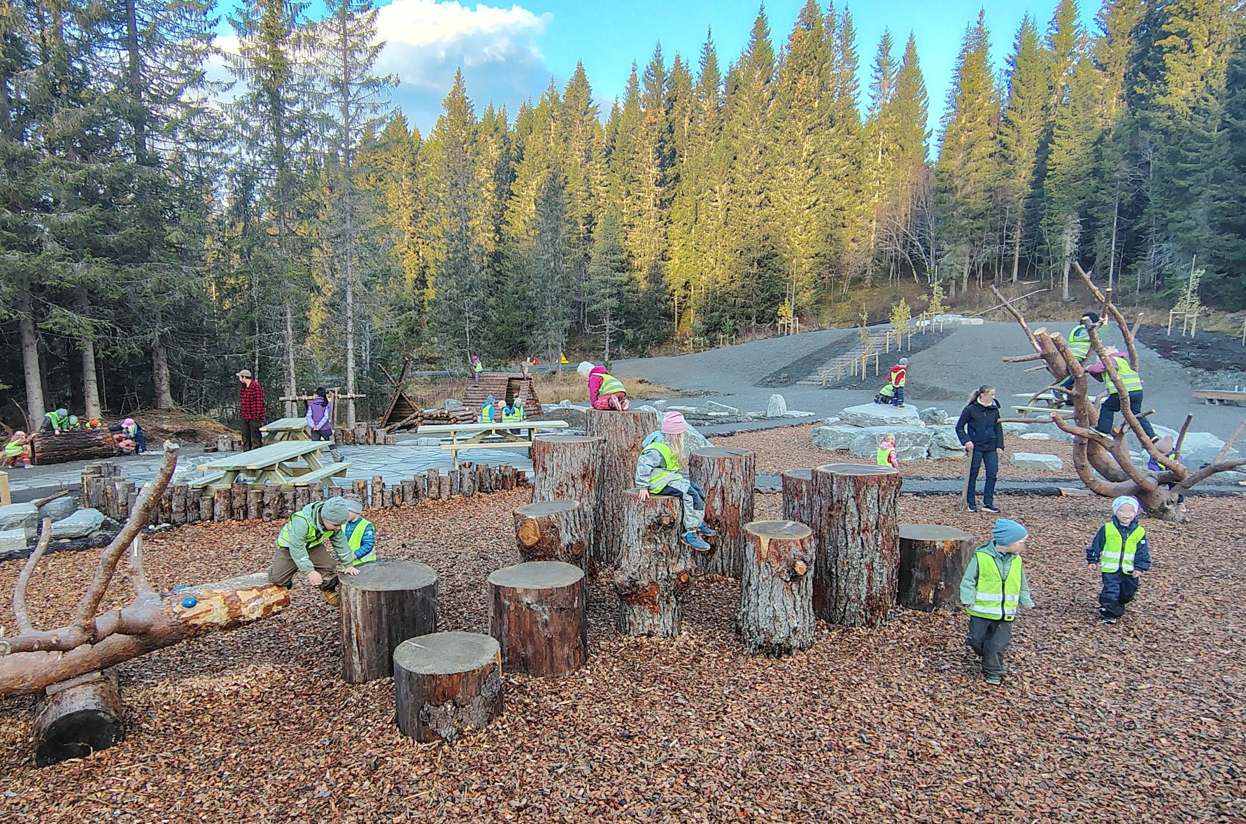It has now been one and a half years since the Granåsen Nature Playground officially opened. Reports indicate a high number of visitors and extensive play activity on both weekdays and weekends. Early Childhood Education and Care institutions, as well as primary schools in the surrounding area, visit the site regularly during the day, and many groups even travel by bus to spend time at the playground. To date, no injuries have been reported in connection with children’s play at the site. Notably, all the natural materials used in constructing this playground are also readily available in Canada.